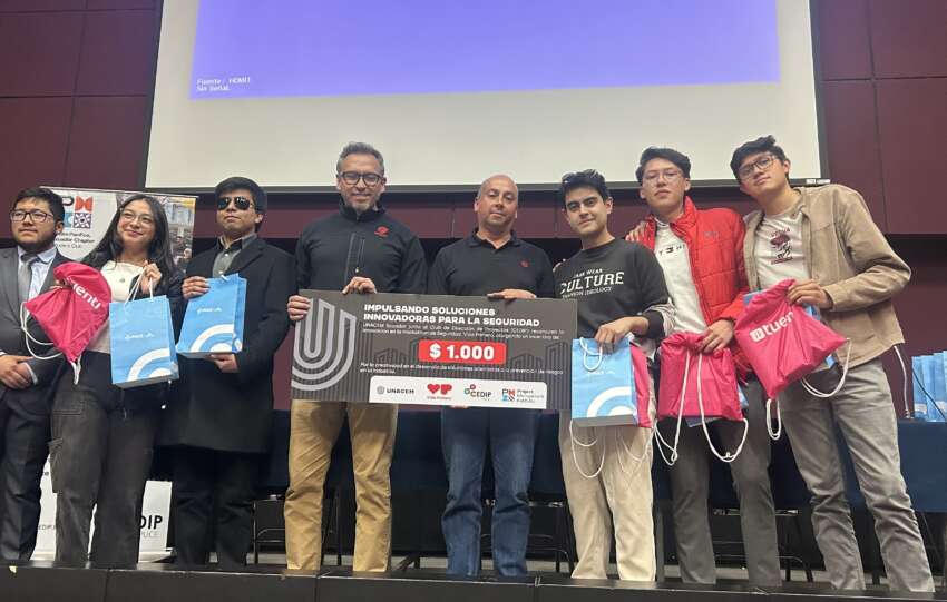 Pie de foto: Ganadores del Hackathon Vida Primero, representantes de UNACEM Ecuador y PUCE.