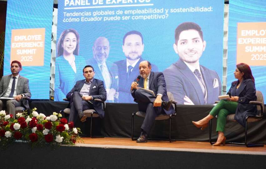 Expositores durante el panel Tendencias globales de empleabilidad y sostenibilidad en el cual analizaron cómo Ecuador puede ser más competitivo en términos laborales.