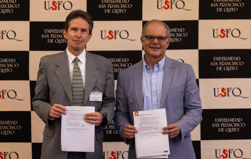 Pie de foto de: de izquierda a derecha Ignacio Bustamante, Presidente Ejecutivo de Novopan y Diego Quiroga Ferri, Rector de la Universidad San Francisco de Quito