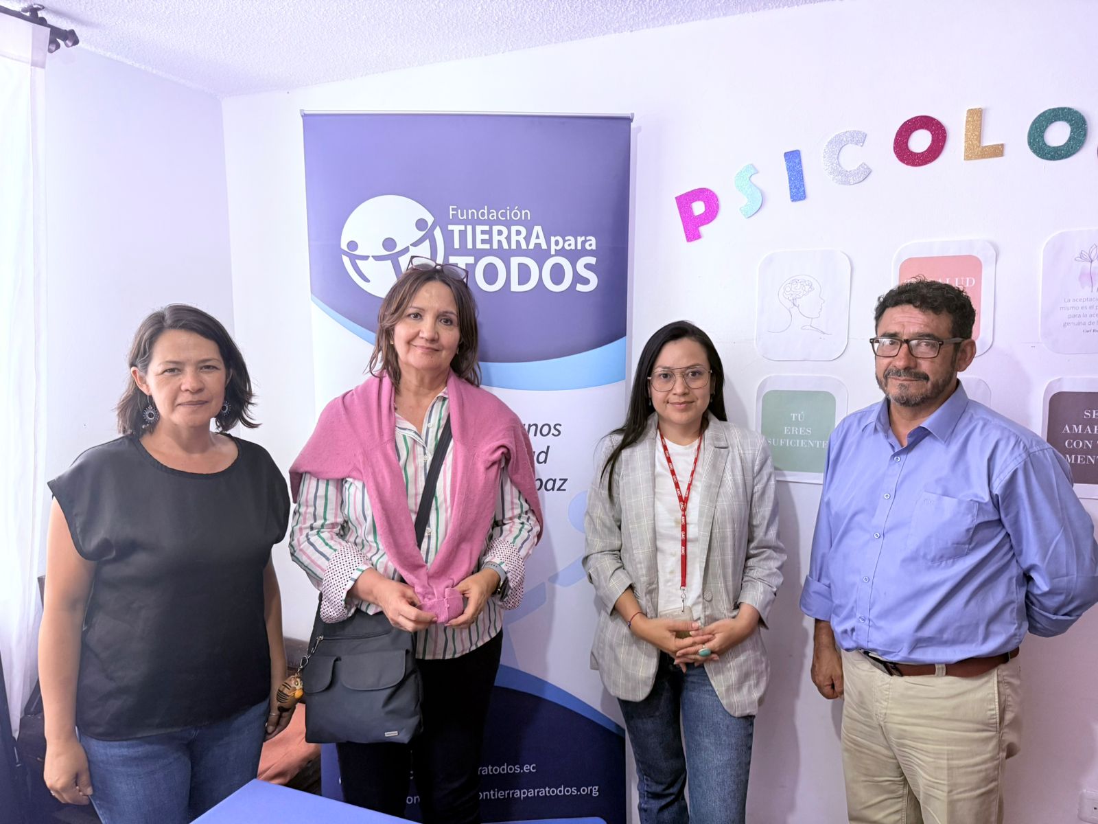 Visita del equipo técnico de la Embajada de Canadá a la Fundación Tierra para Todos. De izquierda a derecha: Micaela Hinojosa, parte del equipo técnico de la Fundación; Ma. Lorena Pasquél y Estefanya Gordillo, representantes de la Embajada de Canadá; y Pablo Iturralde, director de la Fundación.