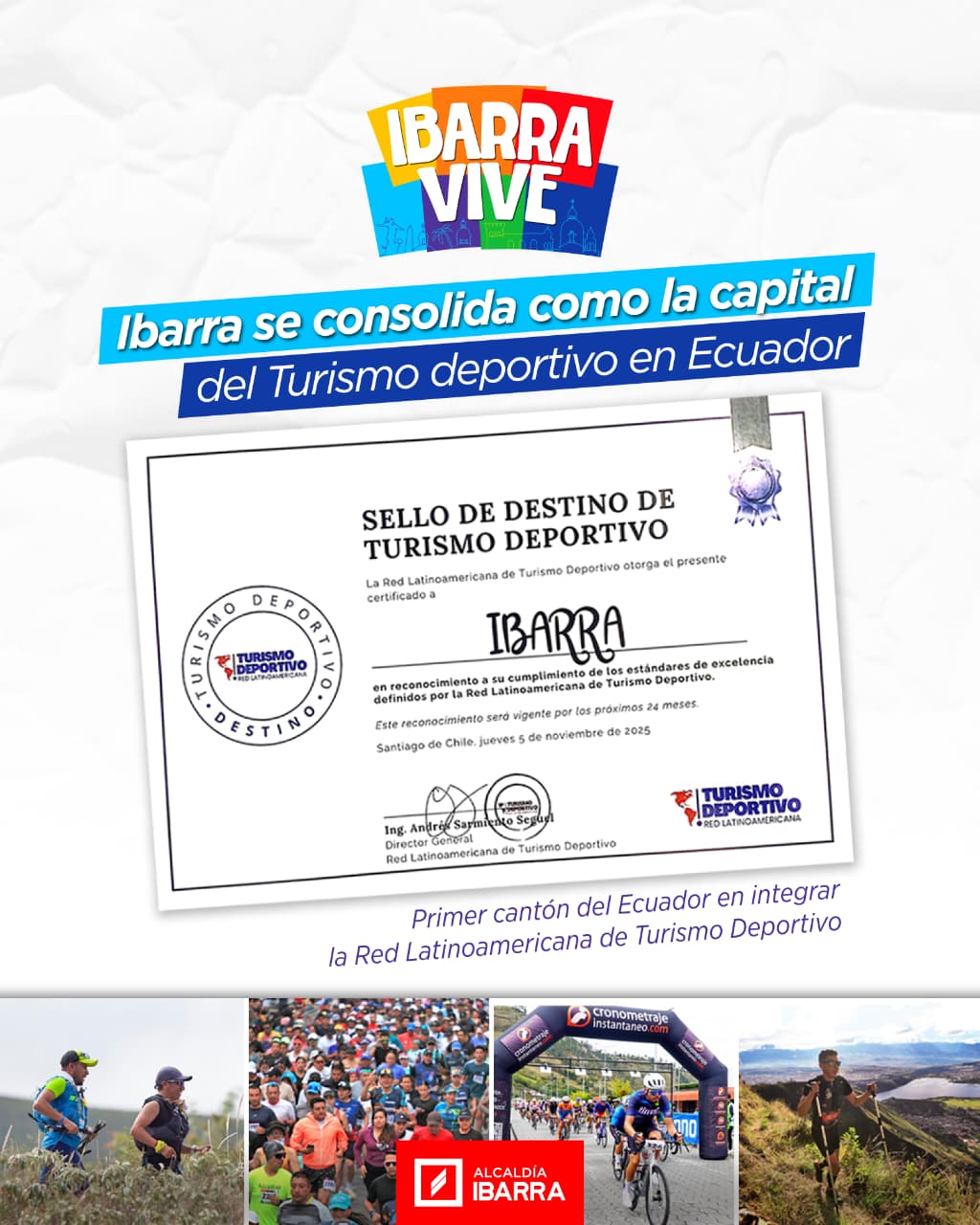 Ibarra.- En el marco del II Congreso Latinoamericano de Turismo Deportivo, celebrado en Santiago de Chile, la ciudad de Ibarra fue distinguida con el prestigioso Sello de Destino de Turismo Deportivo otorgado por la Red Latinoamericana de Turismo Deportivo, consolidándose como un referente regional en esta modalidad turística.